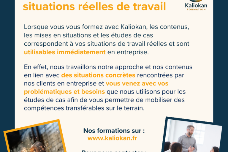 Dans de nombreuses formations professionnelles, les contenus sont construits à partir de situations types, parfois éloignées des réalités vécues en entreprise. Si ces approches apportent des repères théoriques, elles montrent leurs limites dès lors qu’il s’agit de passer à l’action. Chez Kaliokan, nous avons fait un choix différent : partir des situations de travail réelles…