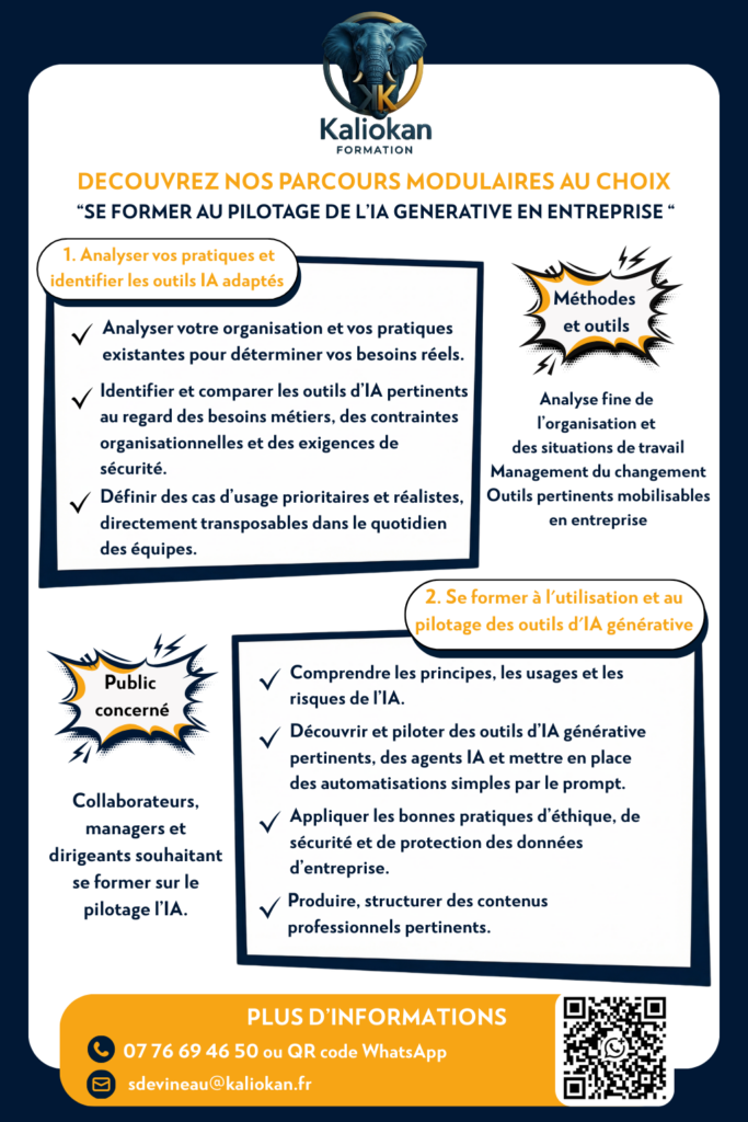 Parce que nous attachons une importance particulière au fait d’être à jour des évolutions technologiques et d’en maîtriser les usages concrets en entreprise, nous avons réalisé une formation de formateurs spécialisée en intelligence artificielle générative. Cette montée en compétences nous permet aujourd’hui de proposer une formation modulaire, opérationnelle et responsable, conçue pour accompagner les organisations dans l’analyse, l’appropriation et le pilotage de l’IA au quotidien, en tenant compte des enjeux métiers, réglementaires et humains.